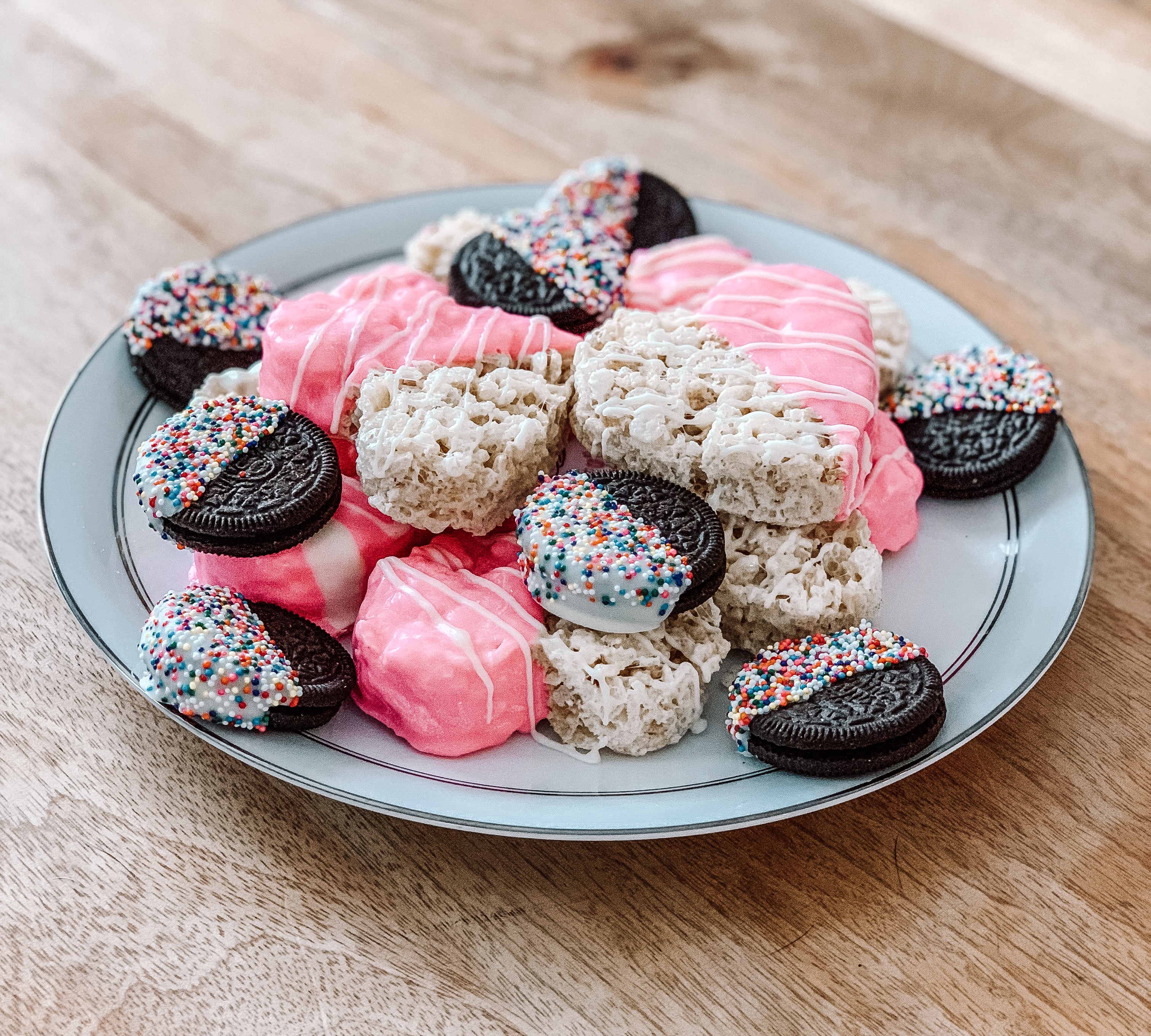 I’m so excited to share these white chocolate dipped Rice Krispie treats and Oreos with you guys! They were so much fun to make and turned out even more adorable than I expected. I love the white and pink together and sprinkles are always a fun detail to add. Plus, they were absolutely delicious. We’ve been snacking on these the past two days and I’m not mad about it. Bonus: I got to wear this adorable apron my sweet friend got me for my birthday! I’m obsessed.