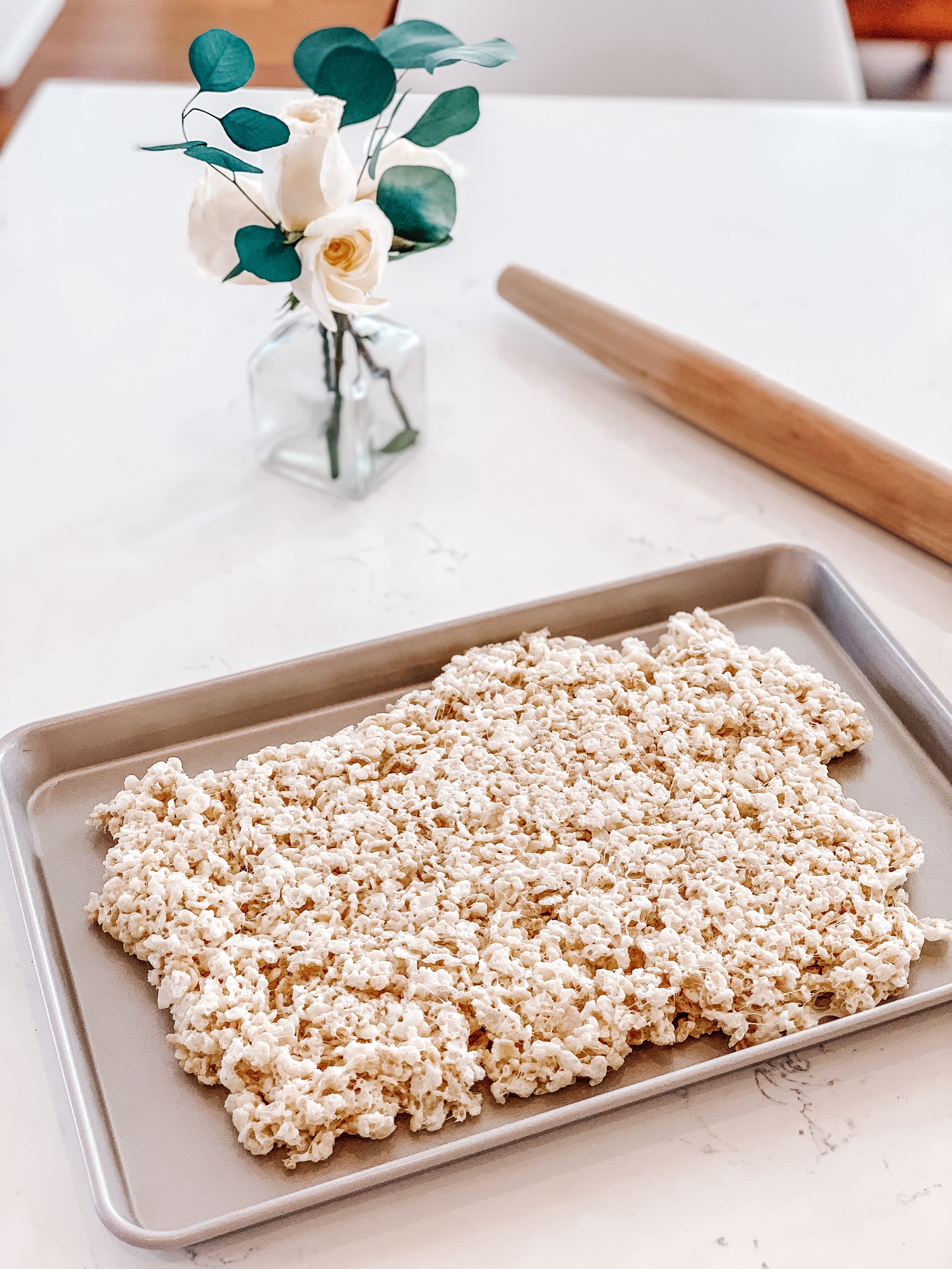 2. Grease cookie sheet and put Rice Krispie mixture on it.