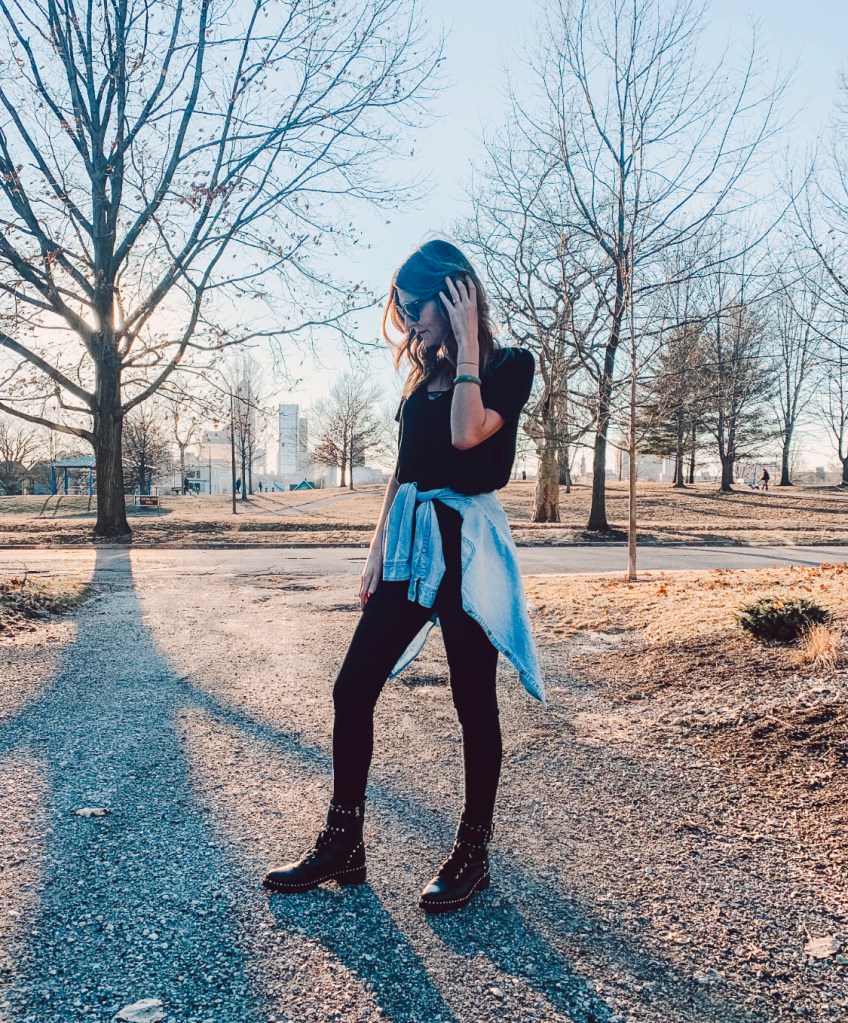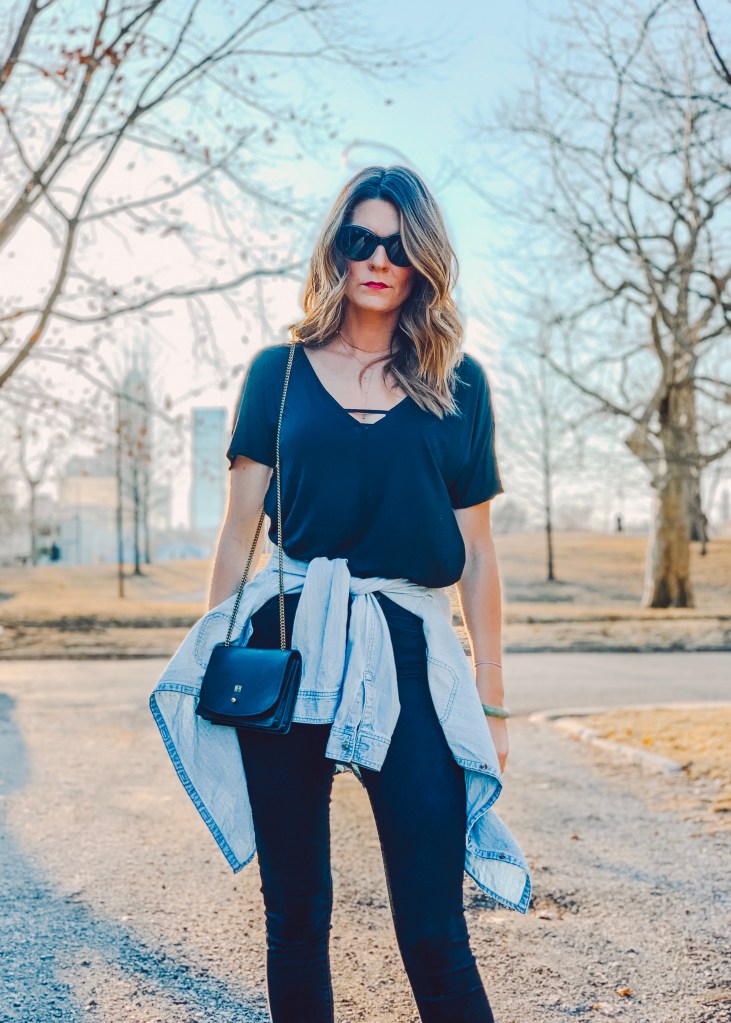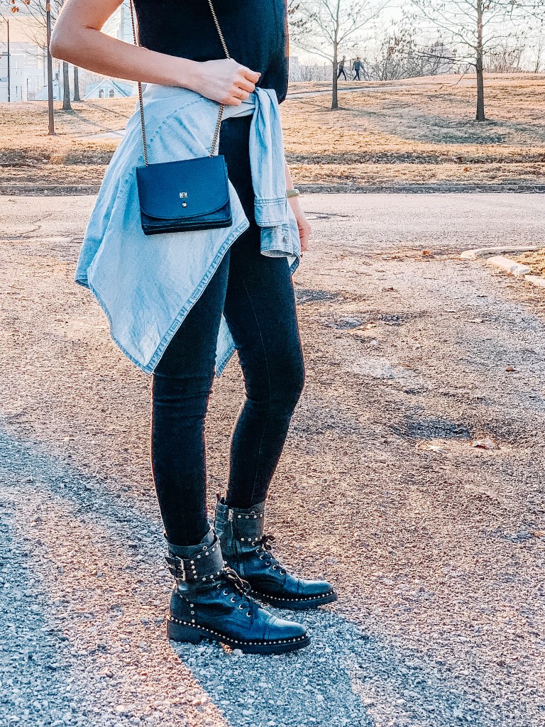 First, I decided on my black jeans and studded boots, which I LOVE by the way. They add the right amount of edge and I’m so glad I didn’t shy away when I first saw them. I wear them way more than I actually thought I would! I found a White House Black Market tee I bought years ago and ended up throwing a cami underneath to create a more interesting neckline. I added black accessories, dark lipstick, and gold jewelry. At that point I liked the outfit, but wasn’t in love. I think it’s important to still feel like yourself when you’re trying something new, otherwise you can quickly lose confidence. I decided to break up the black with a denim top tied around my waist and instantly felt much better. It lightened everything up, while still giving me the rock vibe I was going for!